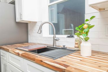This modern townhouse blends durability and style with tile flooring and spa-like tile showers, complemented by warm butcher block countertops and sleek tile backsplashes. Thoughtfully designed interiors feature hardwood and luxury vinyl plank flooring, along with dovetail-constructed cabinets with soft-close hardware for lasting quality.